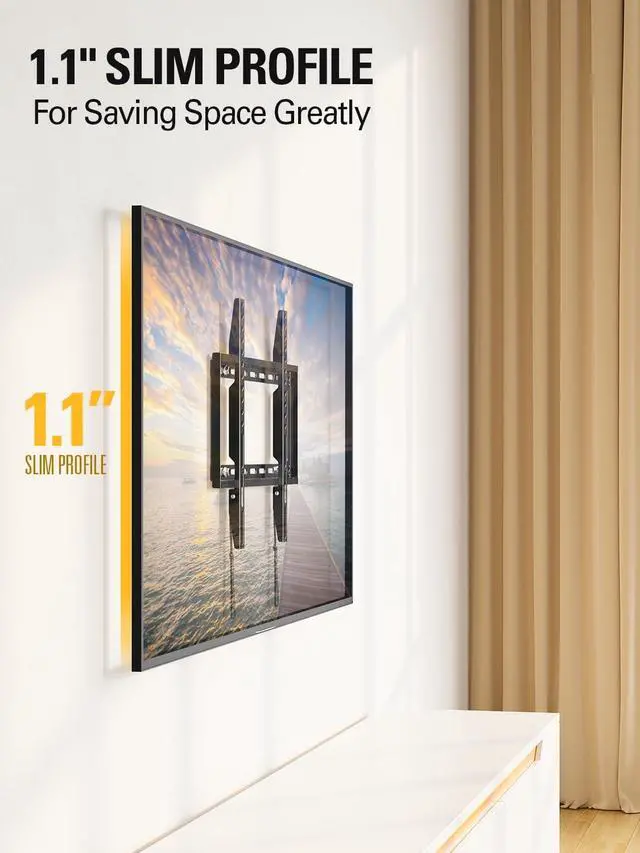 [Low Profile TV Mount] Ultra slim TV mount makes your TV 1. 1 to the wall, narrow gap and greatly saving space Flush TV mount can blend TVs in with any décor, with its extra slim profile and very much of a streamline look. Search MD2361-K for 1.1 flush profile smaller TV mount. Search MD2268-LK for the tilt version TV mount.