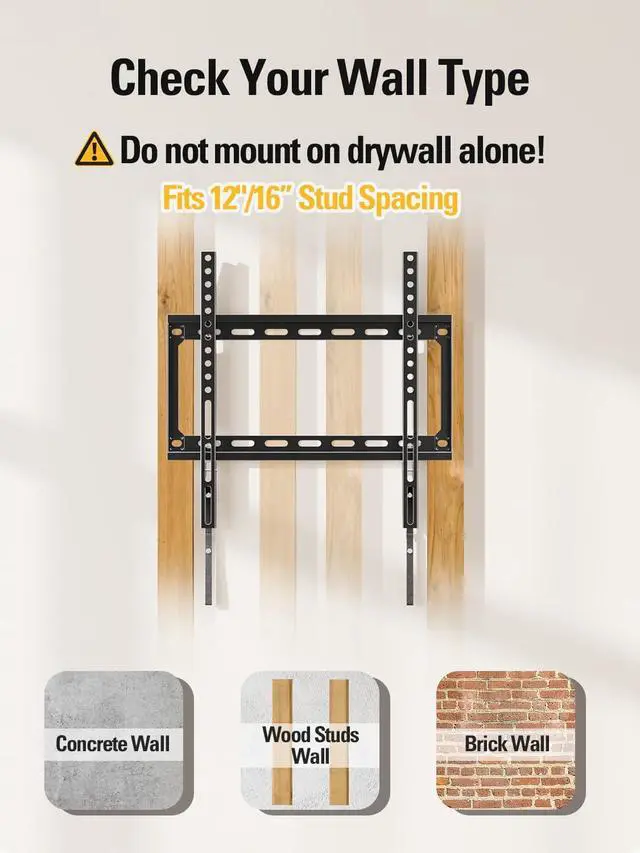 [Universal TV Wall Mount] Fixed TV wall mount fit most 42-84'' TVs, like general 43, 50, 55, 65, 70, 75, 80 flat screen or curved TV up to 132 LBS. Flat TV mount fixed on wall is designed for TV VESA/mounting hole spacing of 600x400mm/500x300mm/400x400mm/400x300mm/400x200mm/300x300mm/200x300mm/300x200mm/200x200mm/200x100mm. TV wall bracket work for most LED OLED LCD, like Samsung/LG/TCL/Sony/Vizio/Hisense etc. large screen TV. TV mount bracket fit 16, 18", 24" wood stud and brick/concrete wall.