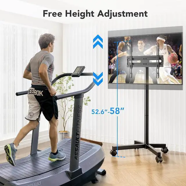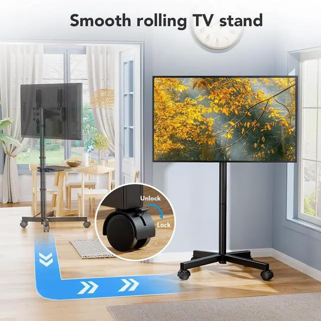 STABLE PORTABILITY: Mobile TV stand wheels with 360 degree rotating provide smoother rolling performance on both hard floors and carpet. Equipped with locking mechanisms, you can easily secure the TV cart in place after transport. Our portable TV stand is carefully crafted with cold-rolled steel and X-shaped base design to enhance its stability
