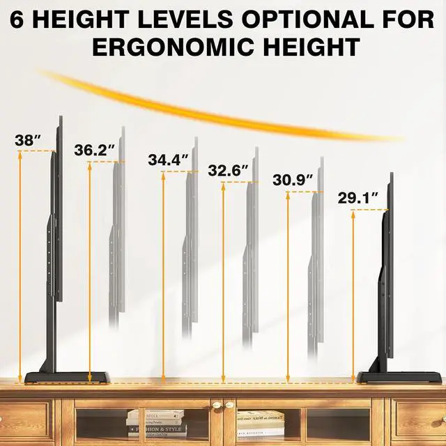 6 Levels of Height Adjustment-Meet Your Personalized NeedsThe TV stand legs offers 6 height adjustments, with each adjustment range being 1.8 inches. Suitable for scenarios such as watching movies on the sofa, working at the dining table, and exercising with a fitness mirror, say goodbye to the cervical vertebrae trouble of looking up and down. The middle section of the stand can be freely disassembled, compatible with small and medium-sized TVS, and can be used for multiple purposes.