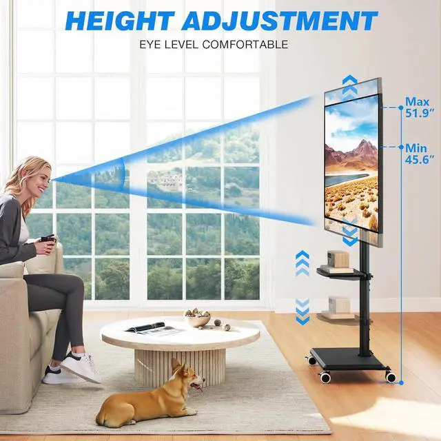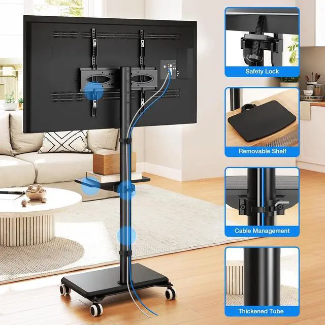 360° SWIVEL LOCKABLE WHEELS - SMOOTH & EFFORTLESS MOVEMENT: This portable TV stand on wheels features four 360° swivel wheels that glide smoothly on both hardwood floors and carpets, enabling easy room-to-room mobility; Once positioned, simply engage the wheel locks to secure the stand firmly in placeeliminating concerns about safety hazards caused by accidental bumps