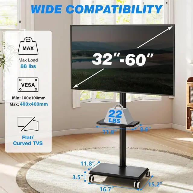 SUITABLE FOR MANY OCCASIONS: Rfiver mobile TV stand fits most 32-60 inch flat or curved TVs with VESA mounting patterns from 100x100mm to 400x400mm, with a maximum load capacity of 88 lbs; This space-saving TV cart rolling TV stand can be placed close to the wall while offering easy mobility, perfect for use in living rooms, bedrooms, offices, meeting spaces, and classrooms