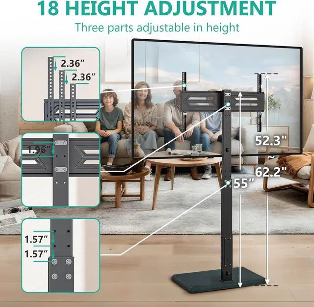 • HEIGHT ADJUSTABLE: The tall TV stand offers 3-position height adjustment for both the support bar and TV bracket, the mounting holes panel features a 2-position adjustment, providing flexibility to customize your viewing experience for office, gym, backyard, game room