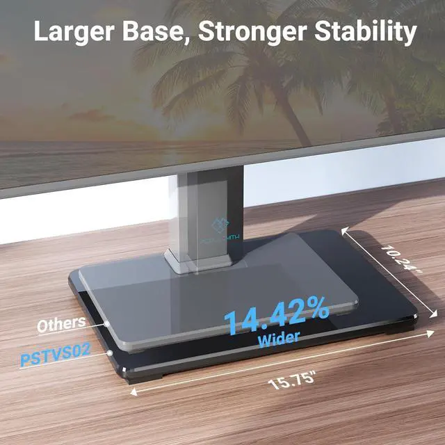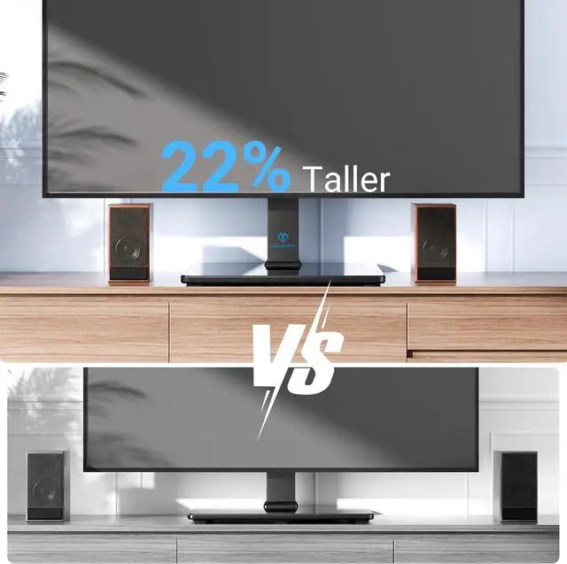 Larger & More Stable Glass Base The black tempered glass gives an added touch to your home theater system and balance TVs weight and keep the whole unit steady. High quality steel construction ensures safety, protecting the television from your kids/pets so it would not knock them over.