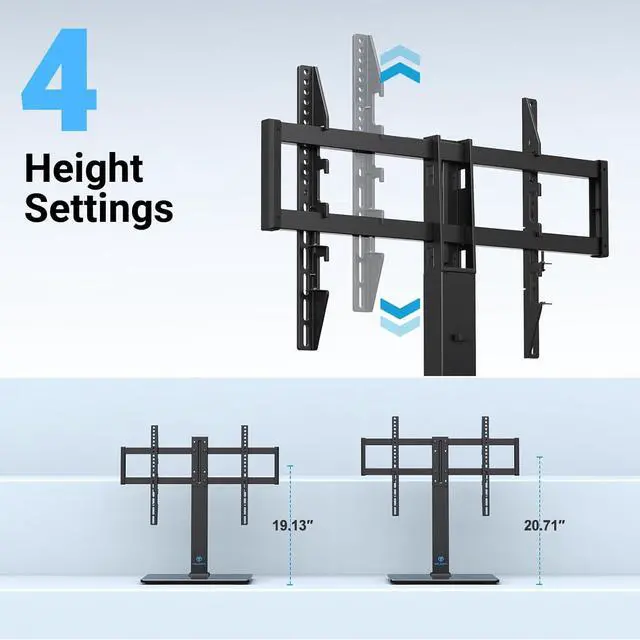 4 Customizable TV Height PositionThe TV mount stand with totally 4 combined height choices will grant you more freedom than any other counterpart on the market. The TV plate has 2 height settings and TV brackets as well have three height choice, which would heighten your plenty of space to place sound bar or place your TV at the lower level to keep it from tipping.