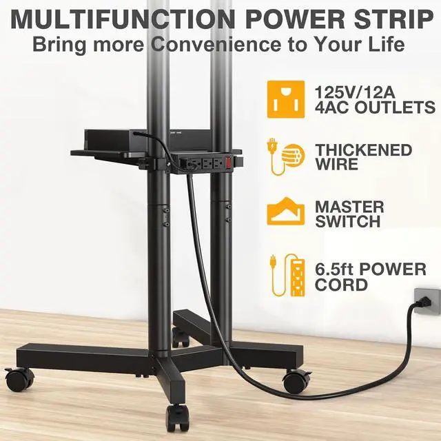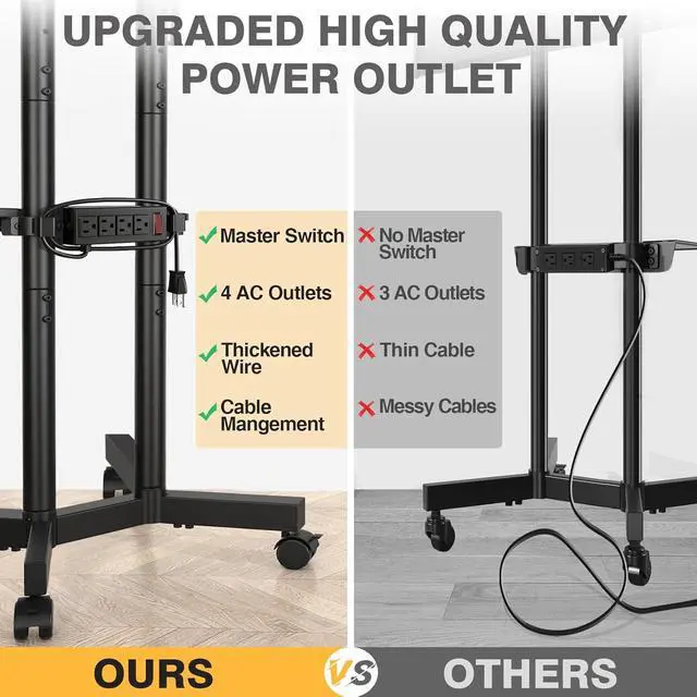 Power outlets: Our tv stand with wheels will come with power outlets. The power strip has 4 AC outlets that can power 4 devices simultaneously. The thickened and lengthened 6.5 -inch power cord is made of 16AWG pure copper, safer than the others' and has better current carrying capacity (12A). It also has a master switch that can be turned off when you are not using it, preventing false touch and ensuring the safety of your family, kids and pets.
