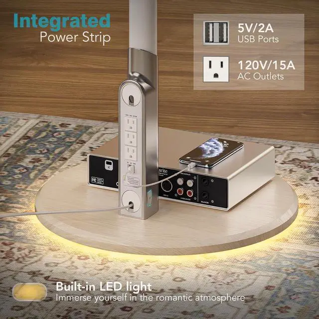 UNIQUE DESIGN: The mobile TV stand comes with invisible wheels on the bottom, extra ambient lighting on the bottom, and a convenient integrated power outlet on the back of the TV stand that includes 2 USB ports. Our portable TV stand is made of steel construction, consisting of white metal panels, a wood-grain colored chassis, warm white light strips, and grey plastic parts, it has been carefully designed to enhance its stability.