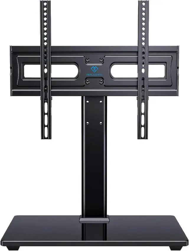 STRONG AND DURABLE: This tabletop TV base is designed with strong steel material and a heavy-duty tempered glass base. Features cable management clips on the back of the unit to keep wires neat and organized.