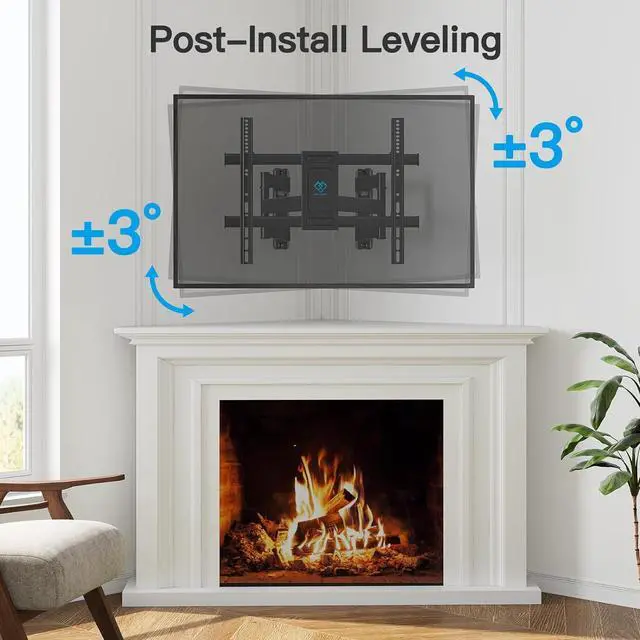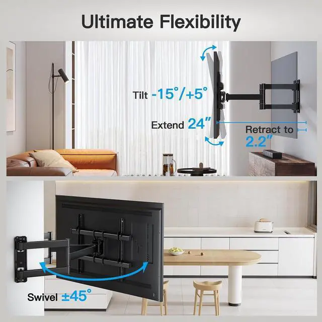 Tilt & Level: Full motion corner TV bracket features a +5°/-10° tilt, 45° swivel (max. swivel angle depends on TV size) and +/-3° level adjustment. Swing it out to your preferred angle, then easily push it back when not in use. Tilt the TV up or down to reduce glare from windows or lights.