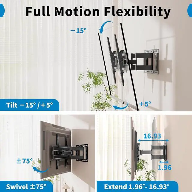 Full Motion for Any Viewing AngleWith ±75° swivel, +5°/-15° tilt, and up to 16.93 " extension, this TV swivel wall mount lets you adjust your screen for the optimal view from any angle. Push it back just 1.96 " for a sleek setup. Well-suited for living rooms, corners, or wide seatingthis is the full motion mount that adapts to your space