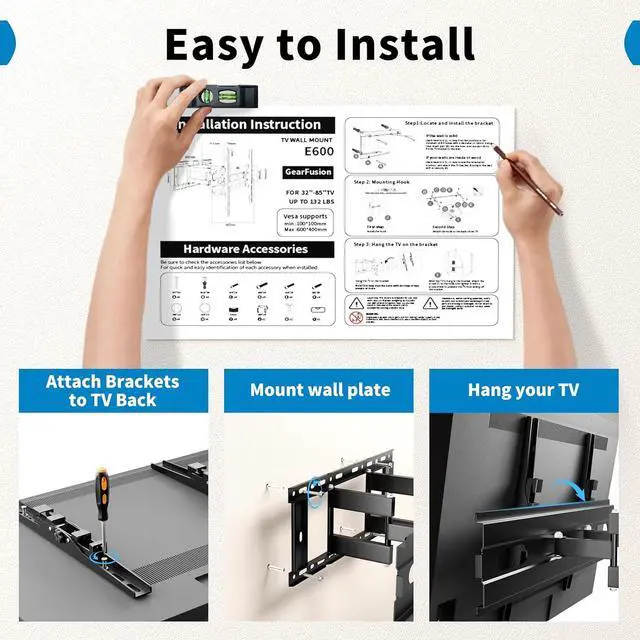 Easy To InstallationInstall your full motion TV wall mount in minutes with our easy-to-follow manual, pre-labeled hardware, and paper template. Includes ±3° post-level adjustment to fine-tune screen alignment. Whether youre mounting a 55", 65", 75", or 85 " TV, youll have it mounted on the wall in no time