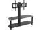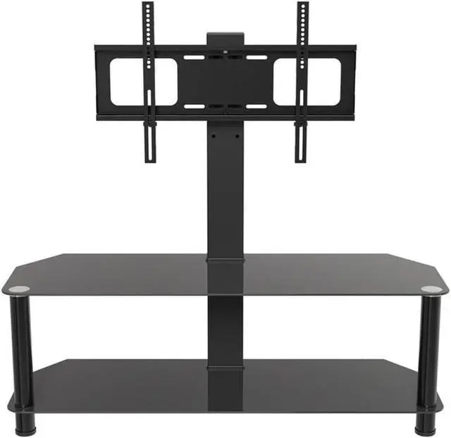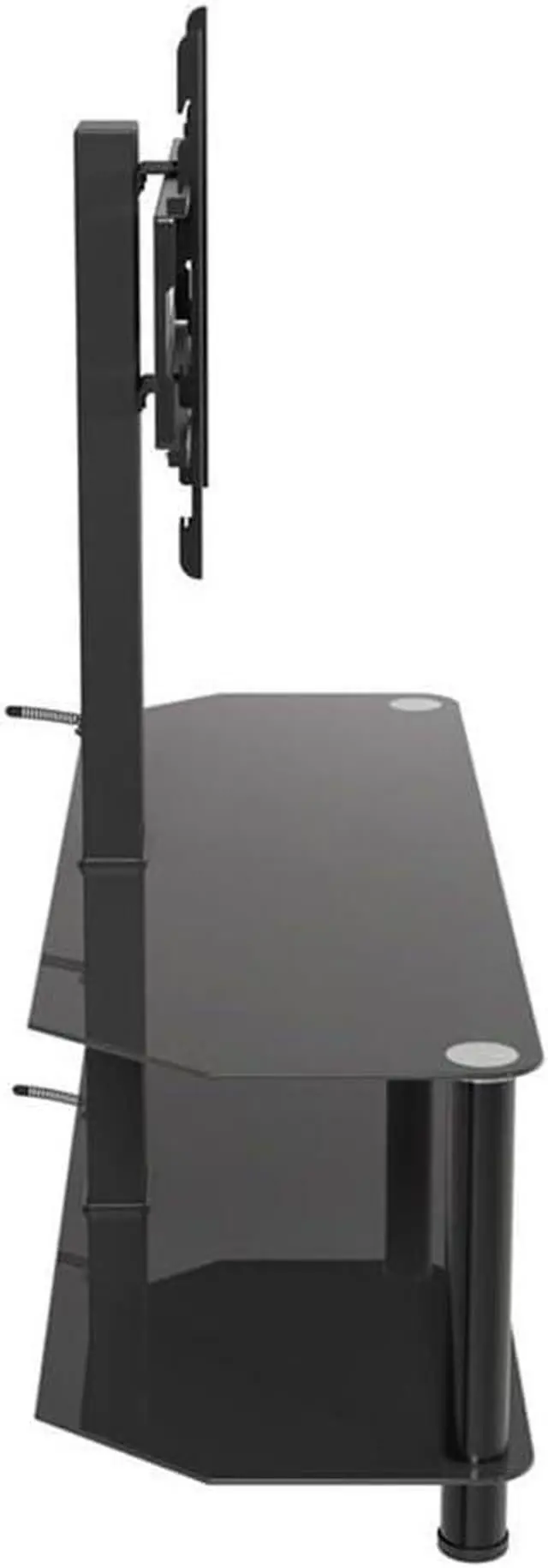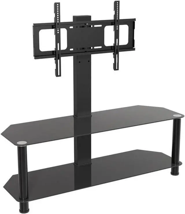 Materials: Steel, glass Finish: Black Supports TVs up to 99 lbs, plus 44 lbs for Middle & Bottom Black Tempered Glass Shelves Angled Back Allows Placement Flat Against a Wall or in a Corner Cable Management via Central Column for a Tidy Appearance