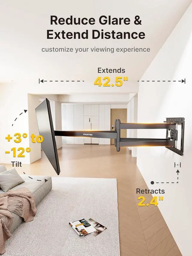 LONG EXTENSION TV MOUNT: This extra long extension TV wall mount can extend 42.5 " from wall for optimal viewing from various positions. When you need to save space without compromising aesthetics, it elegantly retracts to just 2.4 ". Its unique extra-long arm design is particularly suited for corner placement, allowing TV viewing from any spot in your room