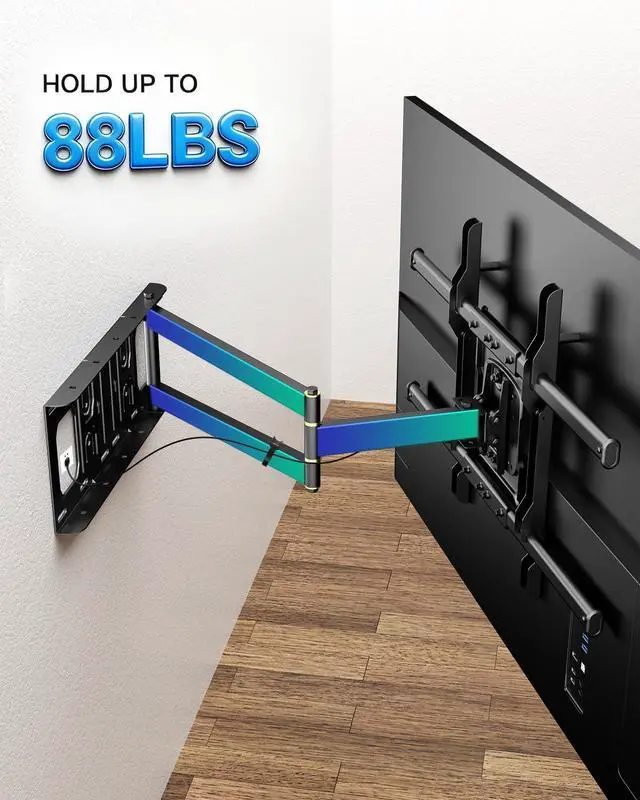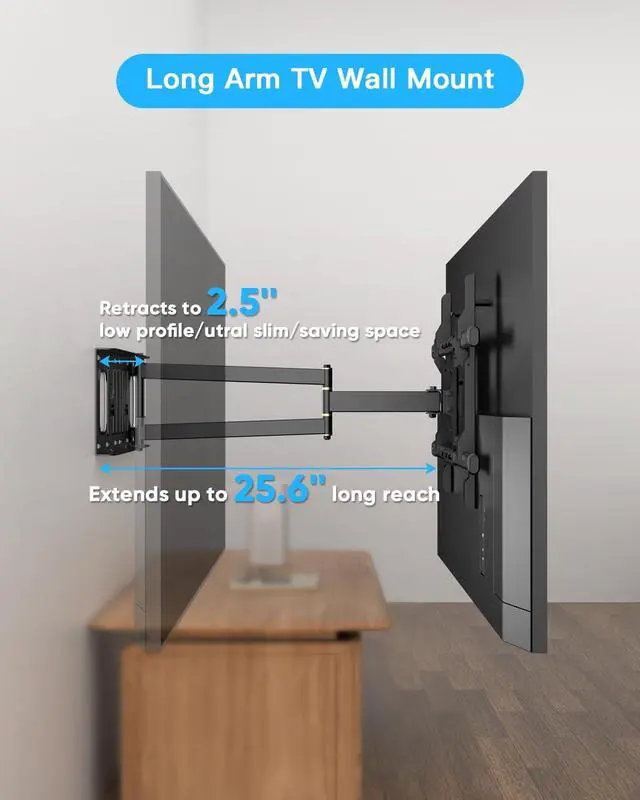 25.6 " Extension Long Arm TV Wall MountThis 65 inch long arm TV mount extends up to 25.6 inch in length. For instance, in a narrow living room, the TV can be tucked flush against the wall to save space; when watching, it can be pulled out to the ideal position for an optimized watching angle. In a spacious villa living room, this long extension TV wall mount can also be used to fill the space. Moreover, long reach TV brackets exude a premium feelthey' re practically a standard feature in villas.