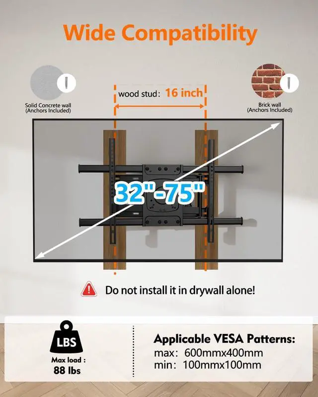 Ideal for 60, 65, 70, 75 inch TVsThis heavy duty TV mount is for 32-75 inch TV and its crafted from premium cold-rolled steel, featuring solid construction and high-quality materials. It boasts exceptional load-bearing capacity, supporting TVs up to 88 lbs. Furthermore, it has passed triple weight testing, meaning it can safely hold up to 264 lbs. Therefore, for large-screen TVs, like 60, 65, 70, 75 inch TV, this heavy duty TV mount provides ample support.