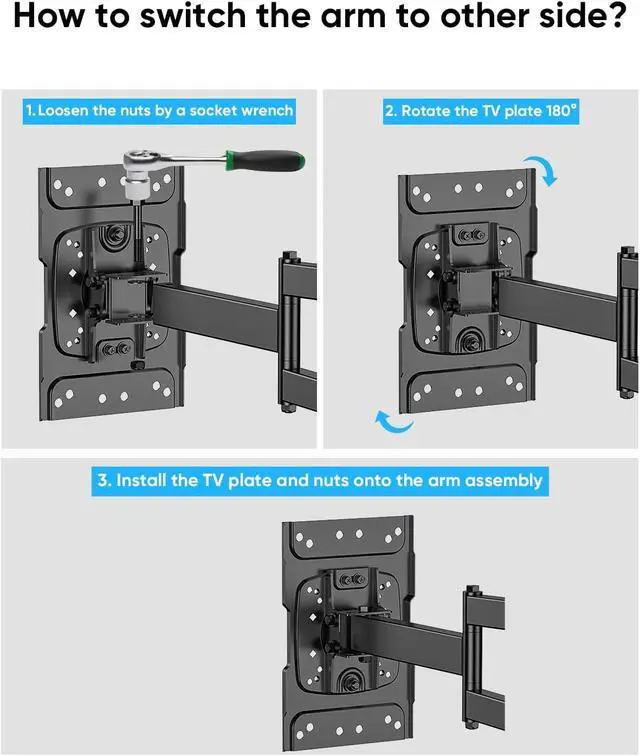 Side TV MountThis 70 inch side TV mount features an exceptionally unique rightward arm extension, a design rarely seen in the market. Should you wish to extend the arm to the left, you can achieve this by unscrewing the nuts and rotating the entire TV bracket 180 degrees and then screw the nuts. Detailed step-by-step instructions are available in the video guide on our product details page.