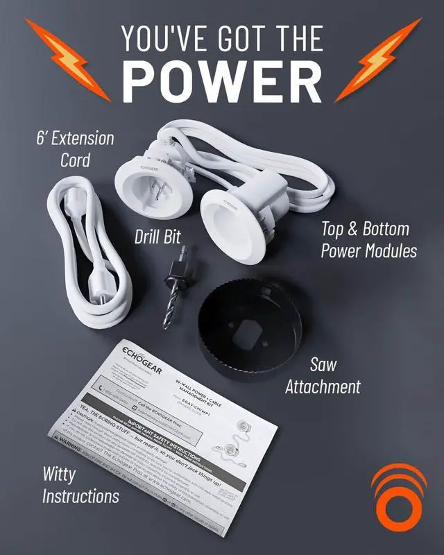 What' s in the box? Upper and lower module ( 3.75 " W x 3.25 " D), 6ft extension cord, driver bit, and hole saw drill attachment. If you hit a snag, contact our customer care team for 7 day a week tech support! ECHOGEAR cares. We' ve also planted over 1.2 million trees in efforts to give back.