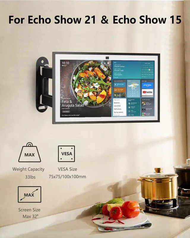 Adjustable Wall Mounting Bracket for Echo Show 15 - Hang your show 15 monitor screen on wall, you can simply screw it to the wall to free up the desk. Such a mounting bracket for echo show 15, echo show 21 also fits well with 10-32 lcd led screen, pc devices or other smart displays, and our monitor wall mount has a classic black color fits for various decoration style. Please check your single stud location and