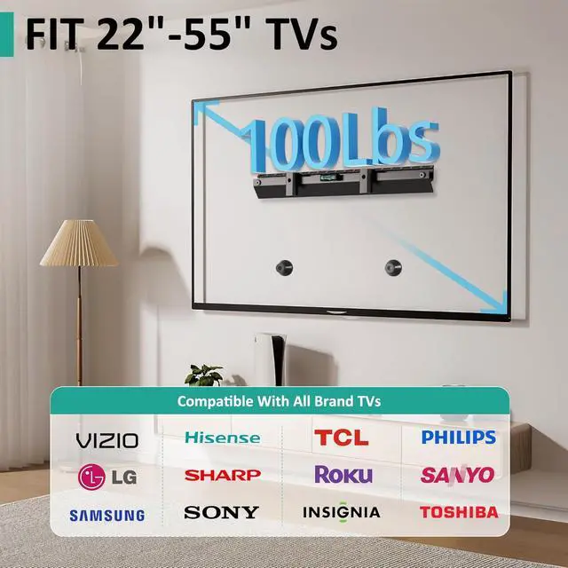 Versatile CompatibilityArtressel no drilling tv wall mount is perfect for your TV! Studless TV wall mount compatible with major brands and supports smart TVs ranging from 22 to 55 inches with VESA sizes from 100×100mm to 400x400 mm. Ideal for drywall installation.