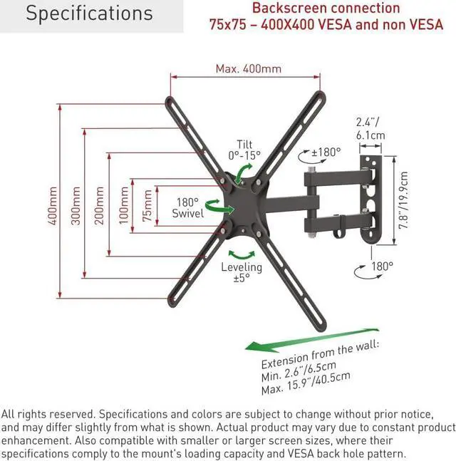 FEATURES - The TV mount fits most 13-56" TVs up to 79lbs. fits TVs with VESA standard (Bracket Mounting Holes Patterns) 75x75, 100x100, 100x200, 200x100, 200x200, 300x300, 300x400, 400x200, 400x300, 400x400 mm and non VESA up to 400x400 mm.