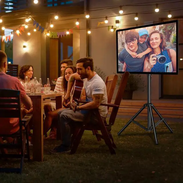 ±20° Tilt & Swivel 360°, Ultimate Viewing ExperienceExperience a truly immersive and flexible viewing experience with the smooth 360°swiveland ±20°tilt functions. Easily adjust the screen to avoid glare and achieve the perfect viewing angle from any seat in the roomwhether you' re enjoying a movie night in the living room, a game outdoors in the yard, or a presentation in a conference room. This tripod TV stand is ideal for corners and tight spaces, providing an ultimate viewing experience anywhere.