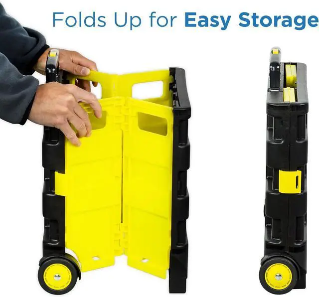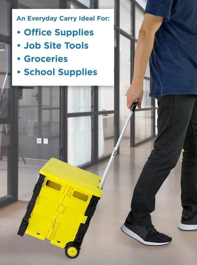COLLAPSIBLE ROLLING CART WITH LID Lightweight yet sturdy, this rolling utility crate with a secure lid is perfect for transporting books, files, groceries, and personal items. Protect your belongings from dust and weather while reducing strain on your back.