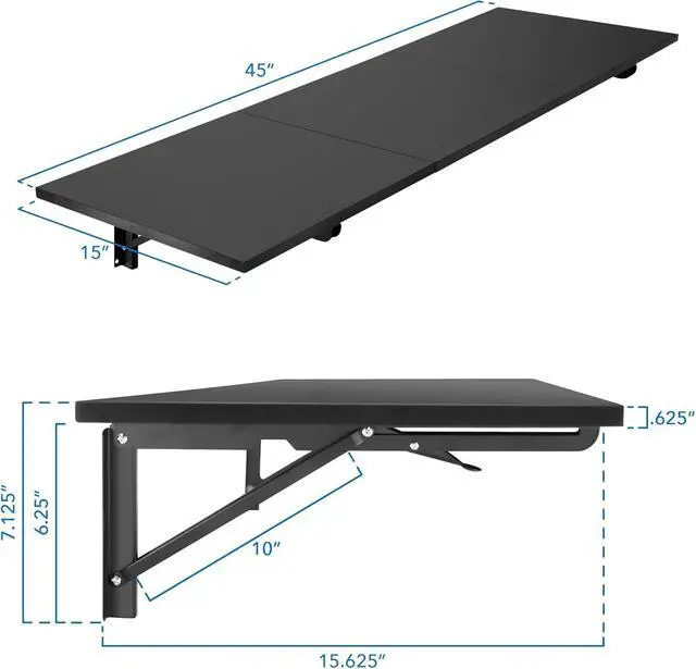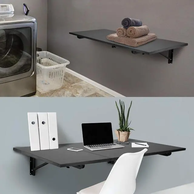 Robust and Reliable: With a sturdy steel and particle board construction, this wall mounted table supports up to 110 lbs. Ideal as a laundry folding table or workspace. The dimensions are 45" x 15" x 7.125 " with 0.625 " thick surface board.