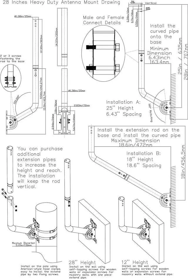 Flexible Design: This bracket supports the use of extension poles, allowing for multiple poles to be added to increase the height. The main unit stands at 13 inches, with each extension pole measuring 13 inches. You can choose to use just the main unit, or combine several extension poles to meet your specific height requirements.