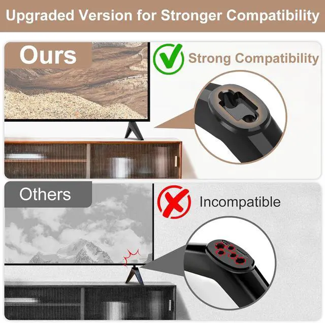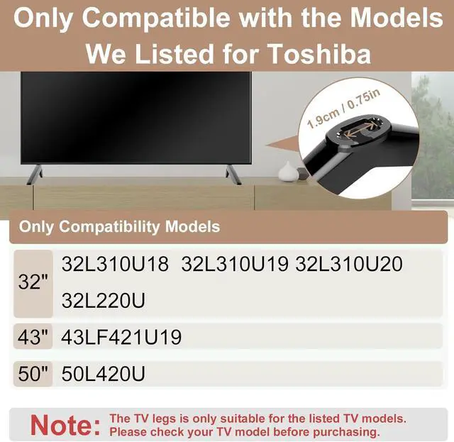 --Compatibilty--TV stand legs for Toshiba 32" 43" 49" 50" TV, for Toshiba TV replacement legs models: 32L310U18 32L310U19 32L310U20 32L220U 43LF421U19 50L420U --Upgraded Version--Our upgraded TV legs for Toshiba boasts a versatile design