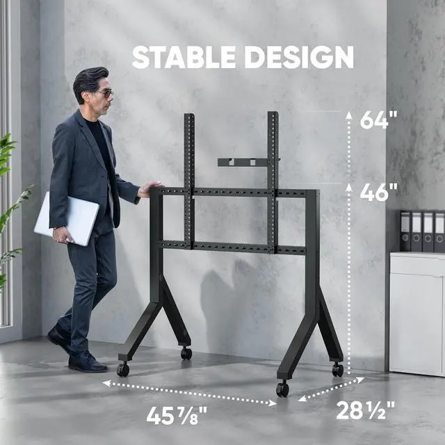 Thought-Out Design The wide-base design enhances stability, ensuring the moveable TV stand remains secure even if lightly bumped. The heavy duty rolling TV stand is engineered to withstand active daily use while keeping large screens firmly supported. Integrated cable channels keep wires hidden and organized, giving this TV cart on wheels a clean, professional look.