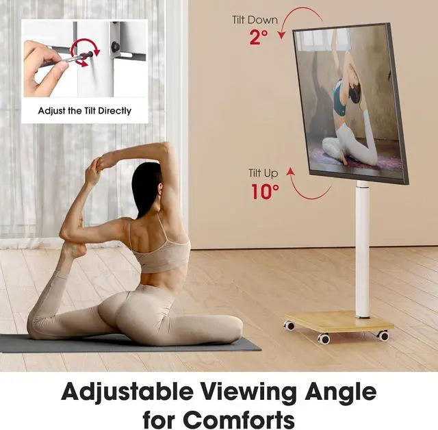 Stability Designed into Every ComponentThis mobile TV stand mount features a 25mm thickened MDF wooden base and hook and metal safety lock, adding super sturdy support for TVs up to 110 lbs. One Tip Design is added to help adjust the tilt function without removing your TV from this TV stand.