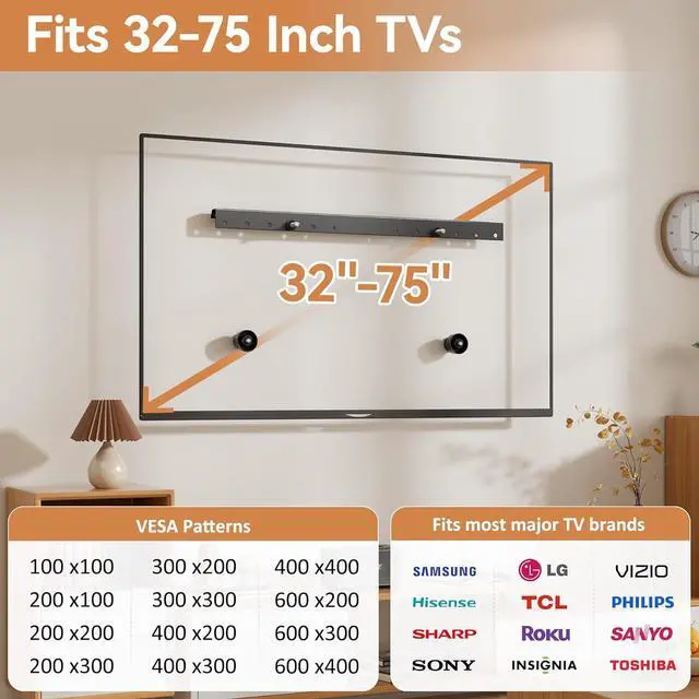 Universal Fit 32 to 75 TVs, Up to 150 lbsNo drill tv mount is compatible with most major tv brands(like SAMSUNG, SONY, LG, VIZIO, TCL, ELEMENT, SCEPTRE, HISENSE), VESA patterns from 100x100mm to 600x400mm. Drywall tv mount is designed for both 32 to 75 inch TVs, like 32, 40, 43, 50, 55, 60, 65, 70, 75 Inch, holding up to 150 lbs