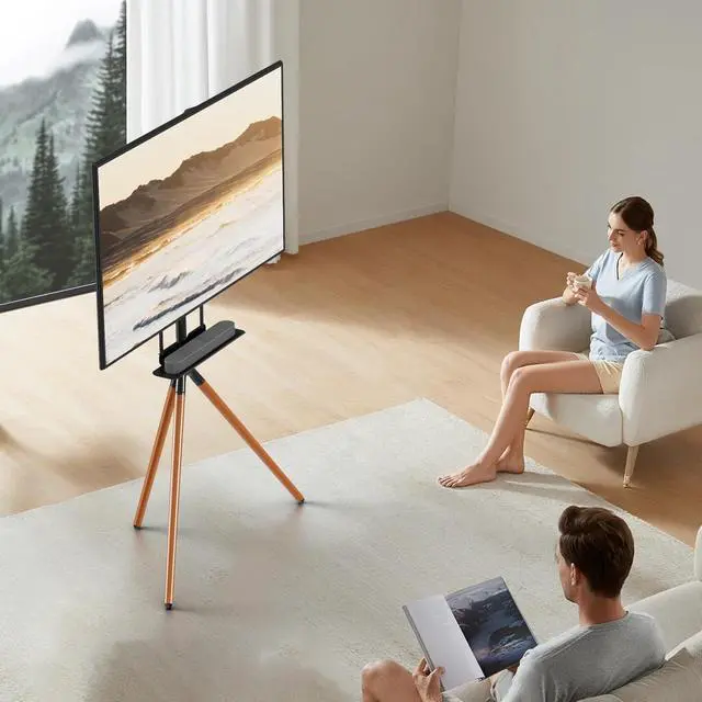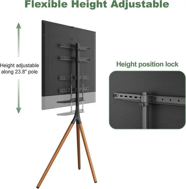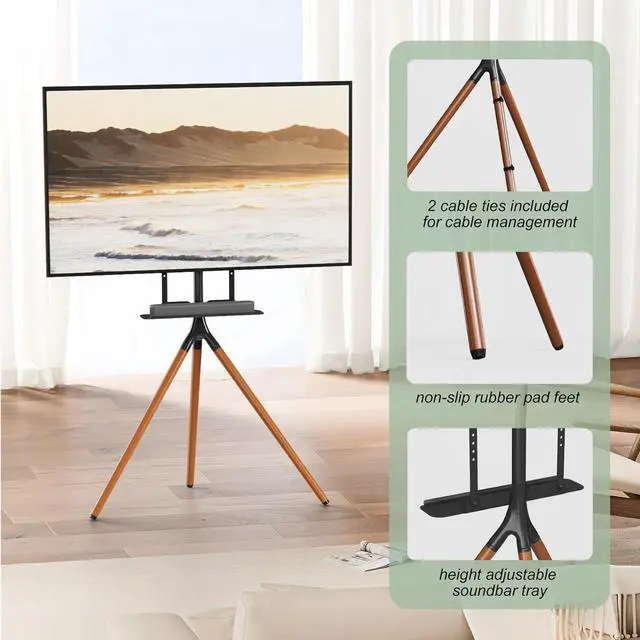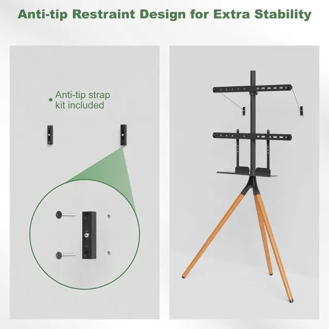Stable & Secure: Constructed of high quality beechwood with solid tripod legs, this modern TV easel stand is quite steady and durable. Anti-scratch rubber feet are designed to protect your carpet and floor. The tripod TV stand also comes with anti-tip strap kit to avoid toppling in case of unexpected bump