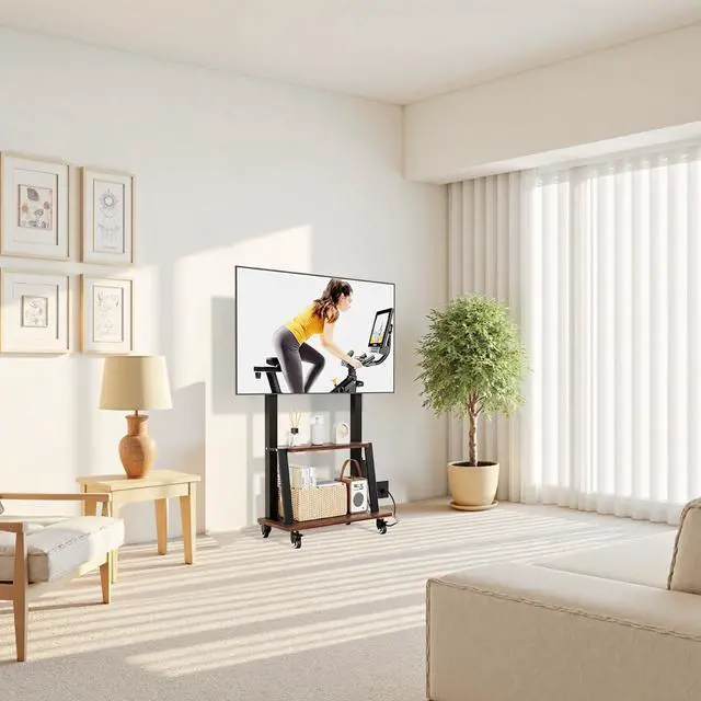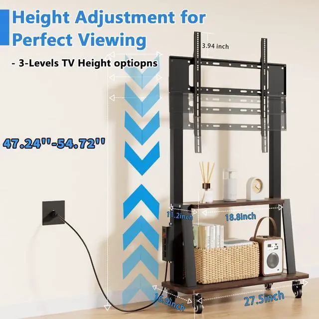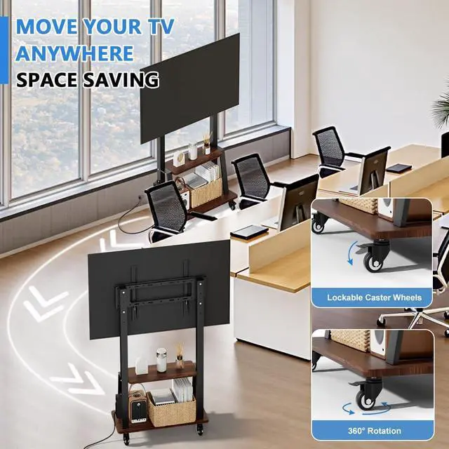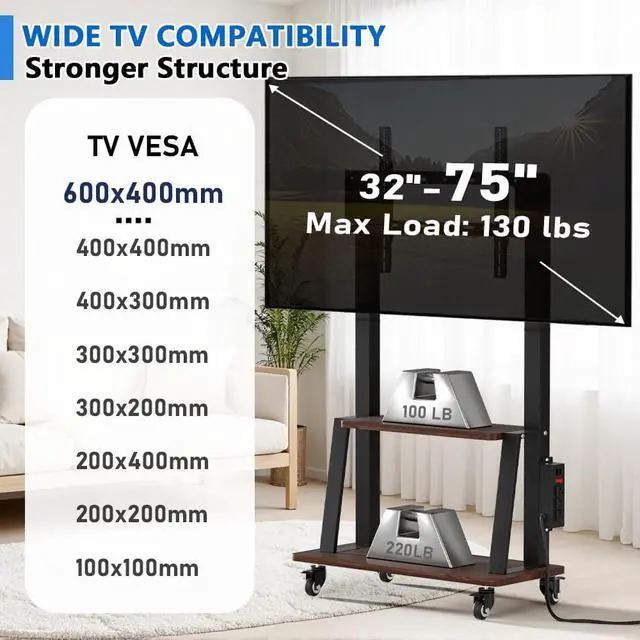 Universal Rolling tv stand: Our rolling TV cart fits 32" -75" LCD/LED/OLED flat/curved screens/monitors with VESA 100x100 (4x4) - 600x400 (24" x16" ). Height-adjustable design for large TV or displays ensures optimal viewing angles suitable for families and businesses. This Duiliuu TV cart is equipped with a built-in power outlet with 3 AC outlets (125V/12A), 2 USB ports (5V/2A) and a 6.5 ft power cord for easy connection to a wall outlet. A good choice for bedroom TV stand or outdoor TV stand.