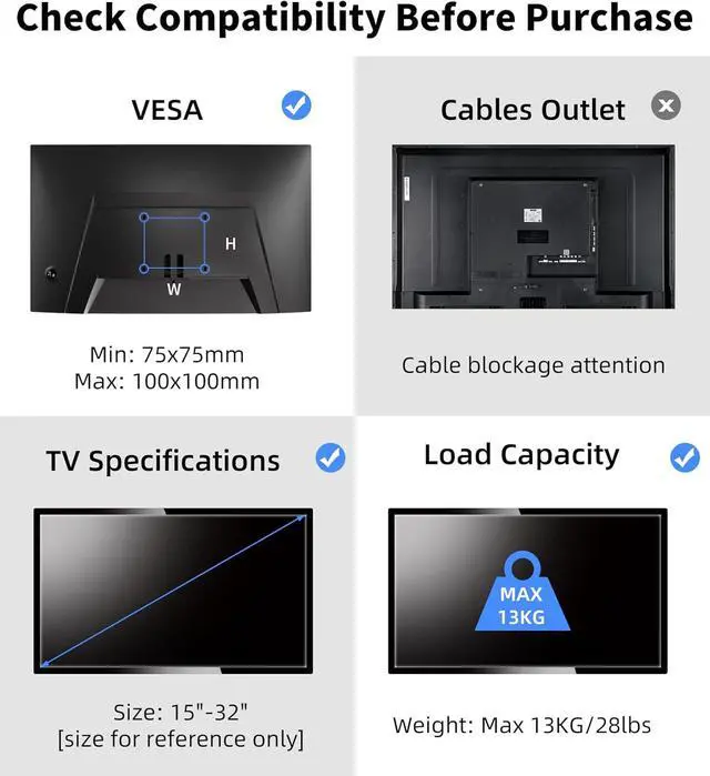 Compatibility - compatible with VESA 75x75mm and 100x100mm, fits for concrete wall/wood stud