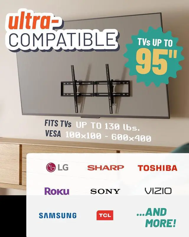 Universal Fit: Handles 42" 95" TVs up to 130 lbs with ease. With VESA patterns from 100x100 to 600x400, it plays nice with all the big brandsSamsung, LG, Sony, Vizio, and more. Unless you bought your TV at a yard sale with a built-in VHS player, youre good.