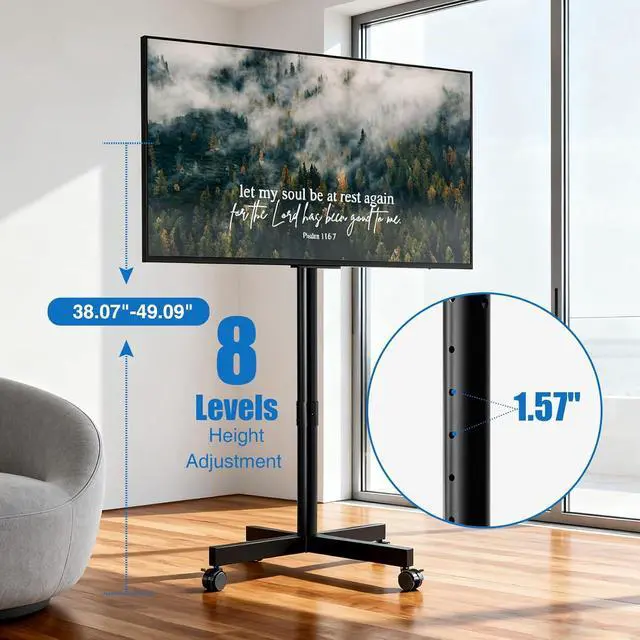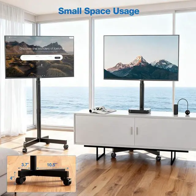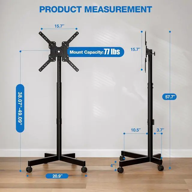 Large Range VESA & Professional Customer Service: VESA pattern of tv stand with wheels has a maximum size of 400x400mm. It' s compatible with more different VESA pattern of TVs than similar products. For monitors or TVs which VESA located in the center, you can rotate your screen according to the usage scenario. This function is perfect for monitors in offices and study rooms. If you have any questions during use or install the rolling tv cart, please contact us.