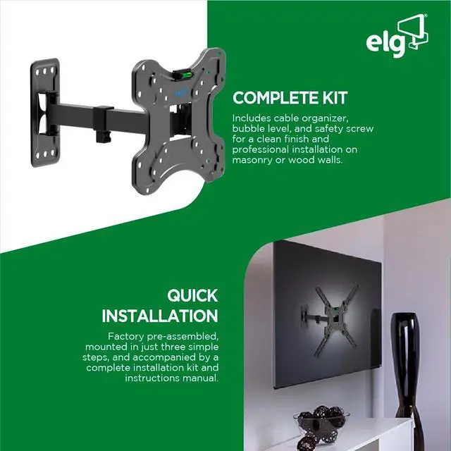 Easy Install Kit: Pre-assembled with hardware, bubble level, cable organizer, and safety screw; supports wood stud or masonry walls.