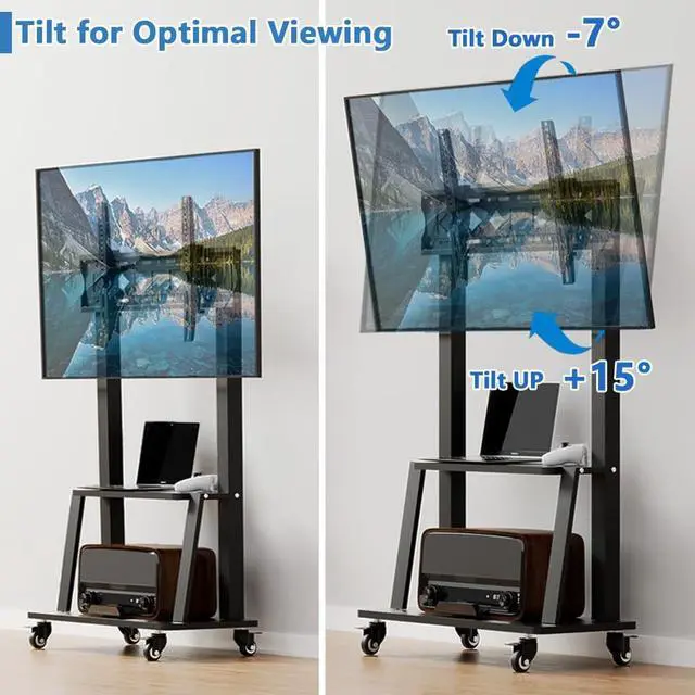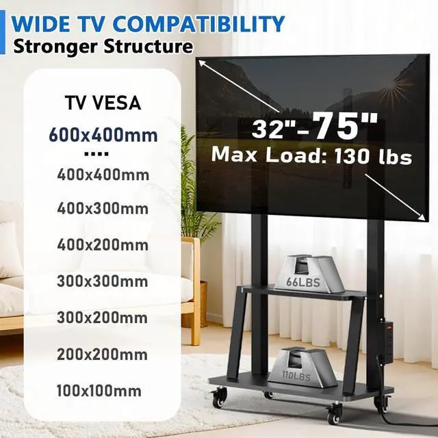 Sturdy & Compact TV Cart: Our mobile TV stand are prepared for most TV brands and types including large screen & premium TV. This TV stand with wheels fit most 32 to 75flat screen/curved TVs with a maximum TV weight capacity of 130lbs, plus safety screw as an additional security. Dual-tier storage design can hold up to an remarkable 66lb upper shelf and 110lb lower shelf for your equipment, provides a stable and safe platform for laptops, media players, sound bar, and game consoles.