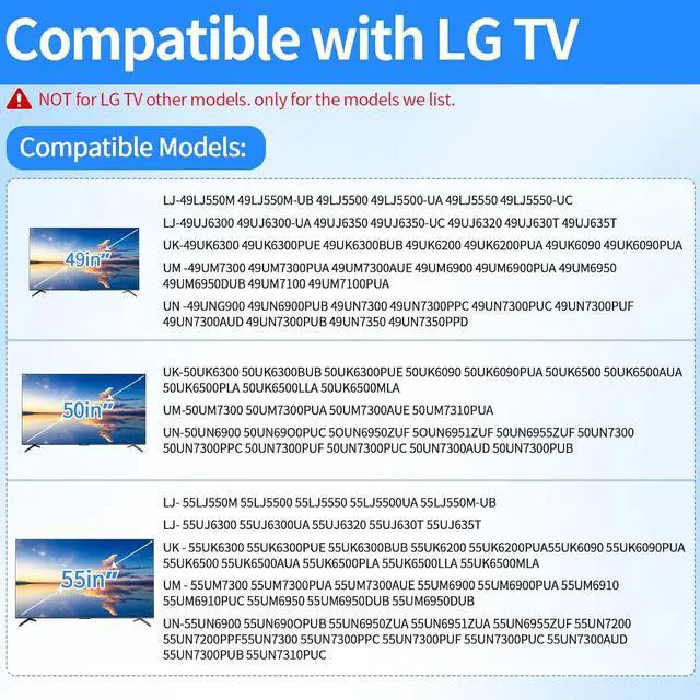 Applicable 55-inch modelLJ - 55LJ550M 55LJ5500 55LJ5550 55LJ5500UA 55LJ550M-UBUJ - 55UJ6300 55UJ6300UA 55UJ6320 55UJ630T 55UJ635TUK - 55UK6300 55UK6300PUE 55UK6300BUB 55UK6200 55UK6200PUA 55UK6090 55UK6090PUA 55UK6500 55UK6500AUA 55UK6500PLA 55UK6500LLA 55UK6500MLAUM - 55UM7300 55UM7300PUA 55UM7300AUE 55UM6900 55UM6900PUA 55UM6910 55UM6910PUC 55UM6950 55UM6950DUB 55UM6950DUBUN - 55UN6900 55UN690OPUB 55UN6950ZUA 55UN6951ZUA 55UN6955ZUF 55UN7200 55UN7200PPF
