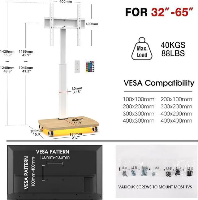 Universal Fit for 32-65 TVs - Wide CompatibilityThis led TV stand fits most 32 37 39 40 43 47 50 55 60 65 inch LCD/LED/OLED TVs up to 88 lbs, with VESA pattern sizes from 100x100mm to 400x400mm. Please confirm the size, weight, and VESA before purchase