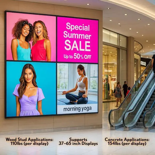 Heavy-Duty Load Capacity: Engineered with reinforced steel rails to support up to 616 lbs total (154 lbs per screen on concrete; 110 lbs per screen on wood studs), ensuring safe, long-lasting stability for large displays.