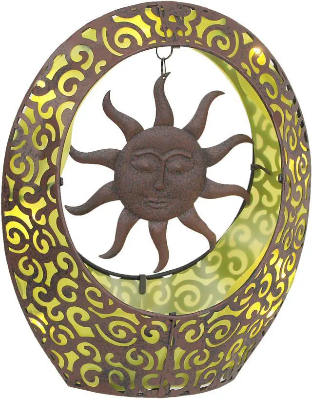 Infuse your home with a warm and rustic ambiance using this captivating LED-lighted sculpture, a perfect marriage of artistry and functionality. Expertly crafted from enduring metal, the piece showcases intricate brown filigree details, adorned with a charming yellow accent that elegantly highlights the central sun motif. Spanning 10 inches in length, 4.5 inches in width, and 12.25 inches in height, this decorative sculpture becomes a beacon of style in any room. The white LEDs embedded within the artwork radiate a gentle glow, creating a serene atmosphere. Powered by two 1.5V AA batteries (not included), these flameless lights are operated through a versatile multi-mode switch, allowing you to choose between standard on/off or a convenient 6-hour-on and 18-hour-off cycle.