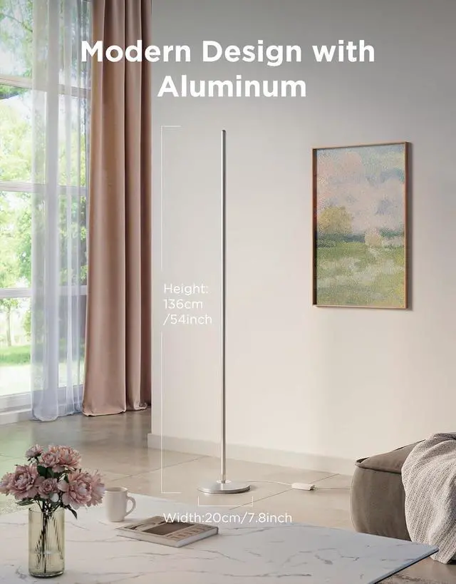 Note: With the height of 136cm and seperate warm white LEDs, this floor lamp provides up to 1000 lumen lighting for daily illumination. Components: 4 aluminum light pole section, 1 aluminum base, 1 silicone light strip, power adapter.