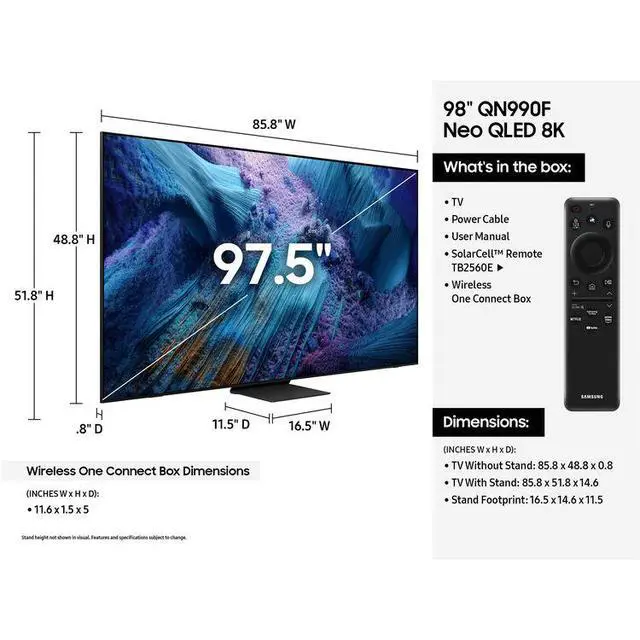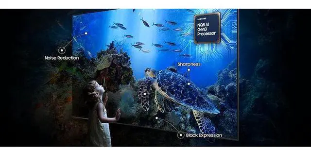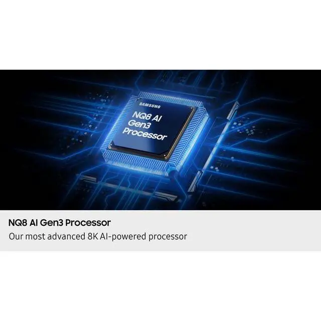Our best 8K TV features phenomenally sharp and smooth picture, enhanced by Quantum Matrix Mini LEDs for exacting detail in dark and bright scenes. Our most advanced processing powers Samsung Vision AI1, optimizing picture, multi-dimensional sound, and breakthrough TV experiences. Nearly edgeless design and a glare-free screen are complemented by a wireless connection hub2 for a clutter-free, modern design.