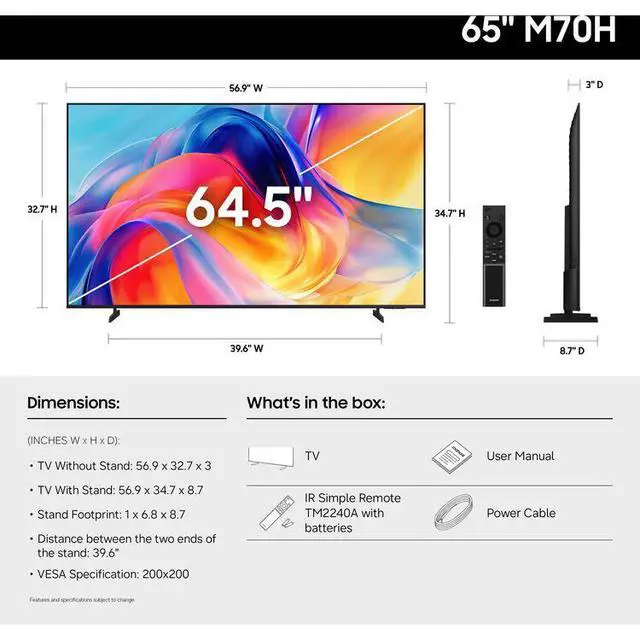 Bright, detailed colors pair together with deep, cinematic contrast thanks to precise mini-LED control and Pure Spectrum Color technology in the M70H 65" 4K HDR Smart Mini-LED TV from Samsung. With a smart TV powered by Tizen, you can enjoy your favorite smart apps and video games, free premium channels with Samsung TV Plus, and know your data is secure with Knox Security.
