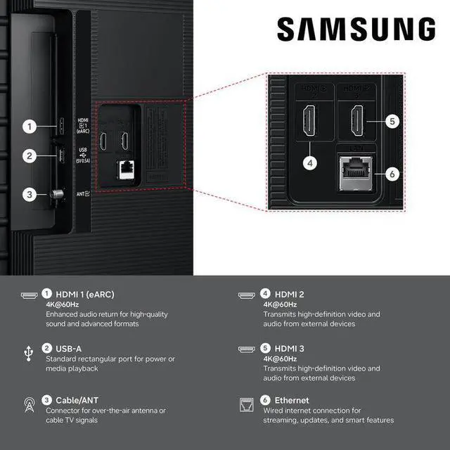 NOTE: Samsung Account required for network-based smart services, including streaming apps and other smart features. A computer, mobile, or other device may be necessary to create/log into the Samsung account (free to download and create). Without an account, only external device connections (e.g., via HDMI) and terrestrial/over-the-air TV are available. Automatic OS updates based on model year; requires an internet connection.