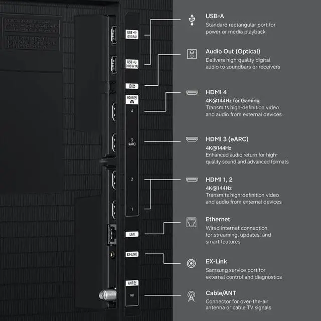 - *Samsung Account and internet connection required for network-based smart services, including streaming apps and other smart features. Without Account log in, only external device connections (e.g., via HDMI) and terrestrial/over-the-air TV (only for TVs with tuners) available. Channels may vary by location and are subject to change. UI is subject to change without prior notice. Automatic OS updates based on model year; requires Internet connection.