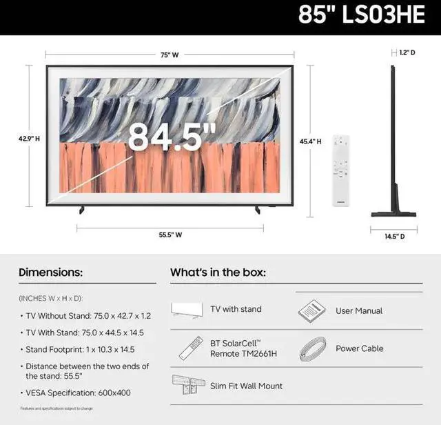 - This art TV beautifully blends into your décor, resembling a picture frame. The included Slim Fit Wall Mount sits flush for easy setup, and offers convenient access to connect wired devices** and stream your favorite content.
