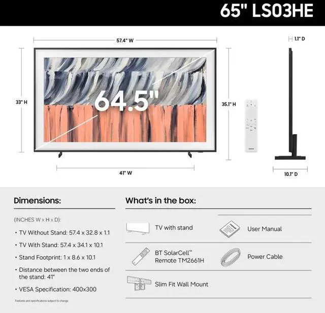 - This art TV beautifully blends into your décor, resembling a picture frame. The included Slim Fit Wall Mount sits flush for easy setup, and offers convenient access to connect wired devices** and stream your favorite content.